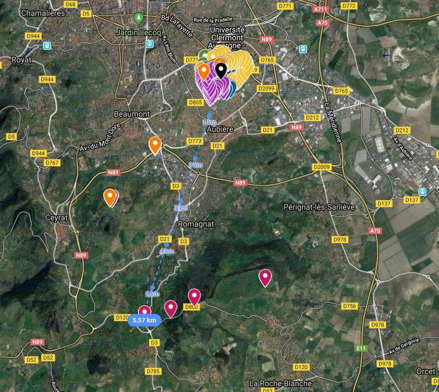 Illustration des mesures LoRa (septembre 2018 - Antenne Portable depuis le toit du Lamp). Une portée de 5,5km a été obtenue.